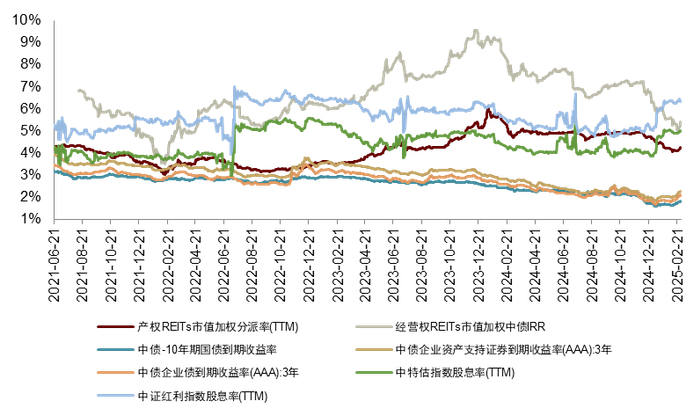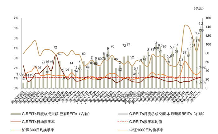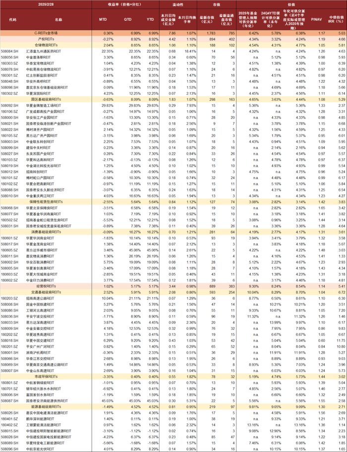 注:1)数据截至2025年2月28日;2)未包含2月新上市的REITs