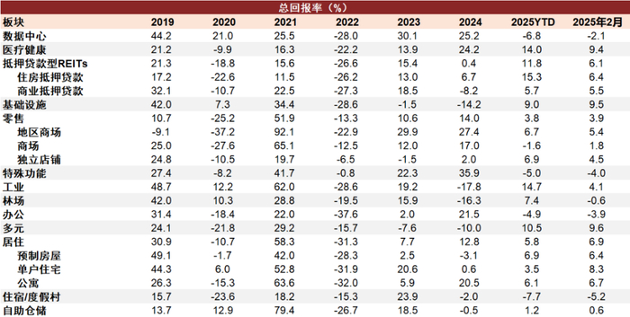 注:1)2019-2025年数据为年度总回报率,2025年2月数据为月度总回报率;2)数据截至2025年2月28日