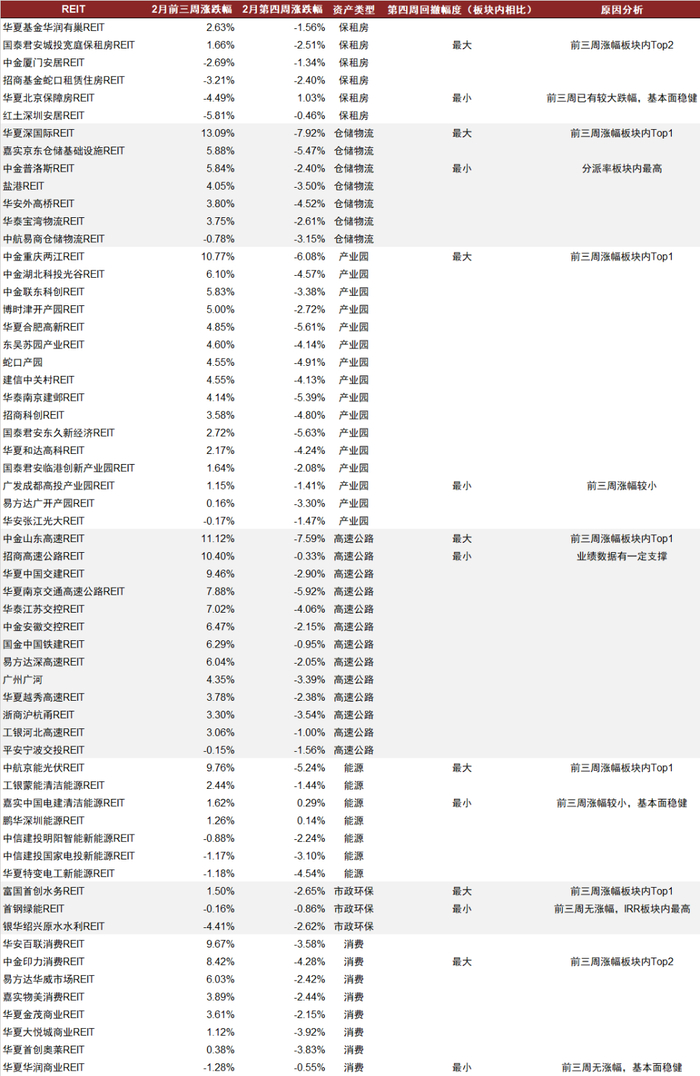 节奏上看,2月前三周市场上涨,第四周下跌。结构上看,前三周涨幅较大的高速、仓储、产业园板块第四周跌幅相对较大,前期已随长端利率有所回调的保租房和公用事业板块第四周跌幅相对较小。板块内部来看,第四周回撤幅度最大的项目均为前三周涨幅Top2的项目,第四周回撤幅度最小的项目则至少具备以下特征之一:1)前三周涨幅较小;2)估值相对便宜;3)基本面相对稳健。