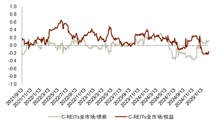 注:1)REITs与债券及权益的关系分别采用中债综合全价指数、沪深300指数计算;2)数据截至2025年2月28日