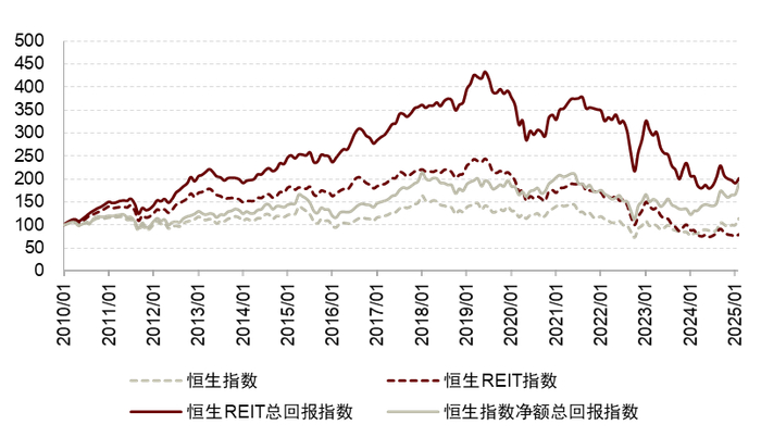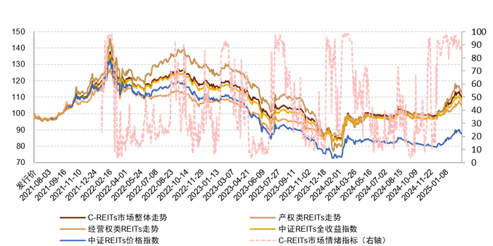 注:1)为了方便对比,我们对中证REITs价格指数及中证REITs全收益指数进行起始日期标准化调整;2)数据截至2025年2月28日;3)C-REITs市场情绪指标根据我们2023年3月24日发布的《公募REITs市场情绪初探》中描述的模型计算,并剔除了所有项目上市首日的换手数据