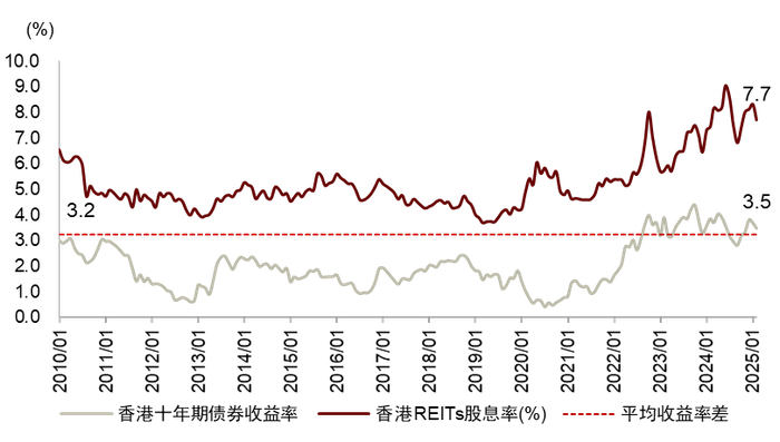图表40:中国香港REITs股息率与香港政府十年期债券收益率对比