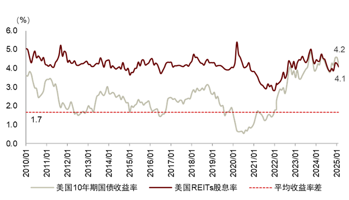 图表36:美国REITs股息率与美国十年期国债收益率对比