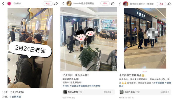 这些人中,一部分是购买过LV、爱马仕、梵克雅宝等奢侈品牌的高净值人群,对于他们来说,老铺黄金相当于奢牌替代品;还有一些是初入职场不久的年轻人,他们没有消费奢侈品的能力,但又有买大件的欲望,老铺黄金则刚好能满足其“理财投资”、“社交货币”的需求。