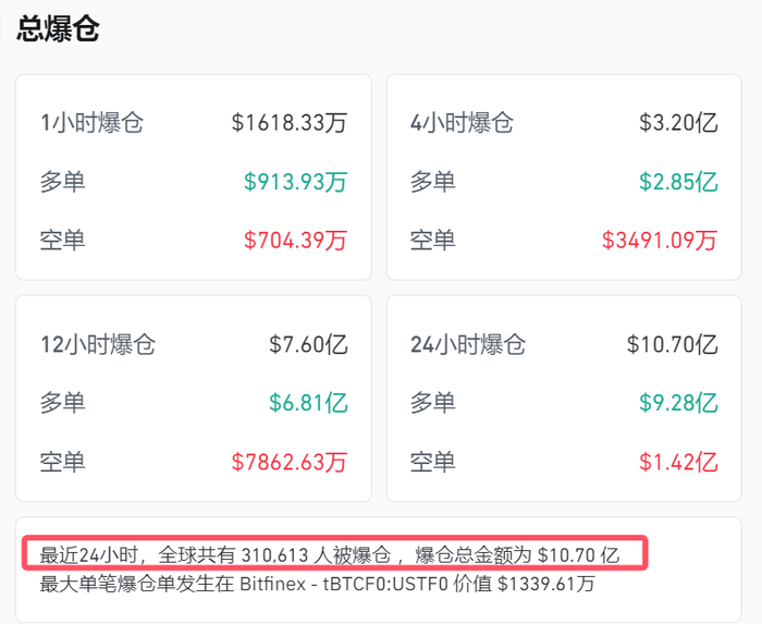 coinglass数据显示,24小时内,加密货币全网爆仓人数超过31万人,爆仓金额高达10.7亿美元。其中多单爆仓9.28亿美元,空单爆仓1.42亿美元。最大单笔爆仓单发生在 Bitfinex-tBTCF0:USTF0,价值1339.61万美元。