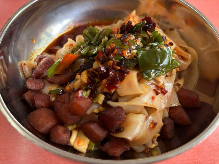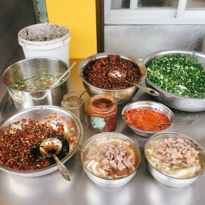 虽然叫素粉,配料却一点也不“素”——肉末、脆哨(长时间小火炸至酥脆的猪肉粒)、辣子鸡丁、红烧肉块等各种滋味的臊子任凭选择,再加上酸萝卜粒、小葱花、油炸花生米,淋入酱油、香醋、花椒面等调料。