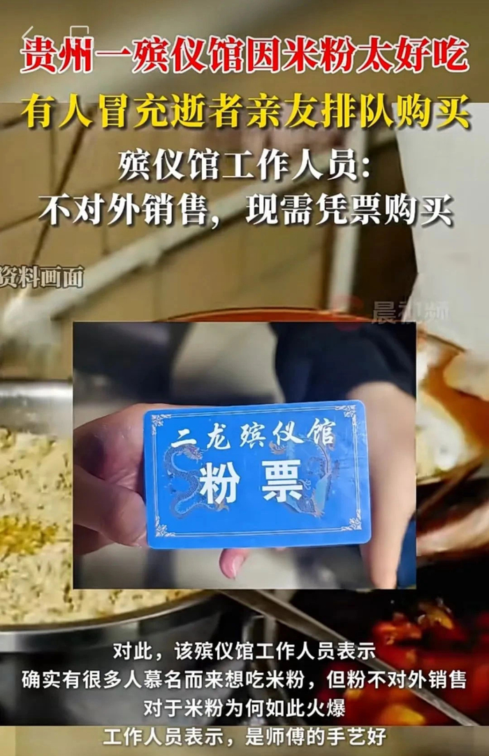 贵州凯里的二龙殡仪馆意外地因米粉太好吃走红。因为殡仪馆的食堂不对外开放,甚至有慕名而来的食客冒充逝者家属排队购买,逼得殡仪馆开始限制凭票购买。