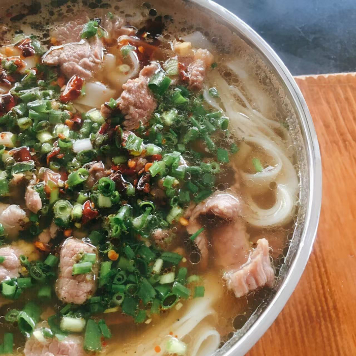 一碗汤色透亮、肉香扑鼻的羊肉粉便大功告成:汤头鲜美不腥,米粉柔韧入味,配合酸辣开胃的配料,这正是遵义虾子羊肉粉的典型风味,带着浓郁的山野气息。