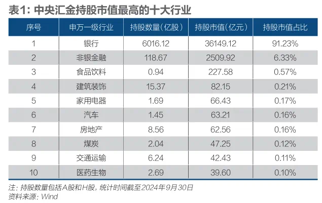 万得数据显示,从上市公司2024年三季报的前十大股东来看,按申万一级行业分类,中央汇金持股数量(A+H股)前五大行业分别为银行、非银金融、建筑装饰、房地产、交通运输行业,持股数量分别为6016.12亿股、118.67亿股、15.37亿股、8.56亿股、6.24亿股。