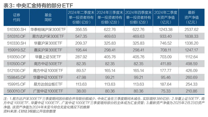 通过公募基金半年度、年度报告,可查询中央汇金的持仓情况。由于目前公募基金尚未披露年报,根据2024年公募基金半年报持仓统计,中央汇金与汇金资管合计持有ETF的资产净值为5838亿元。《财经》结合基金三季报、四季报数据推算,中央汇金通过三季度的增持以及市场回暖带来的净值回升,2024年底时持仓市值已超万亿元。假设中央汇金2025年以来无减持动作,截至2025年2月23日持仓市值约为10345亿元。