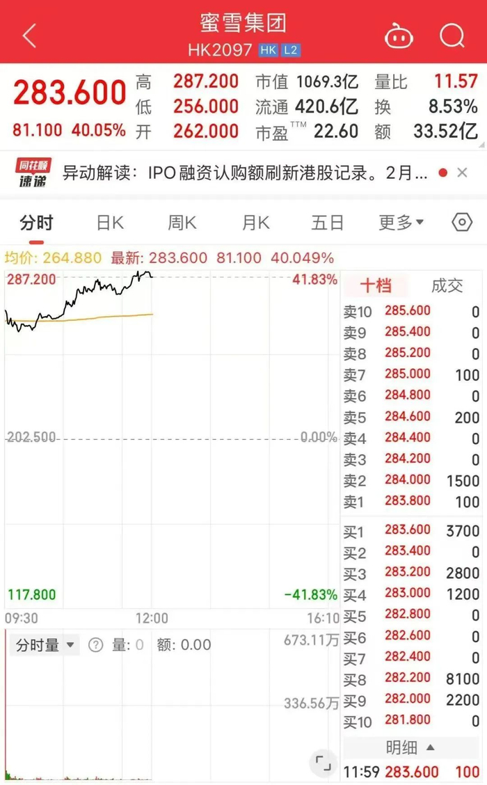 2025年3月3日,蜜雪冰城(证券简称“蜜雪集团”02097.HK)以每股202.5港元的发行价登陆港交所,募资总额34.55亿港元,当日收报290港元/股,大涨43.21%,总市值达1093.47亿港元,成为全球现制饮品行业市值最高的企业。