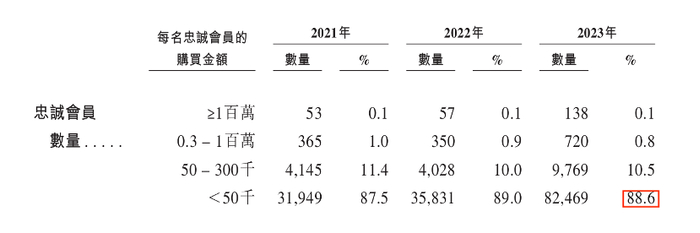即便是老客户,通常年购买金额也低于5万元。招股说明书显示,2023年,老铺黄金近九成的客户购买金额在5万元及以下。