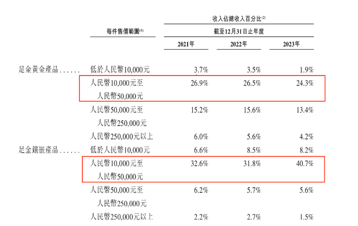 从销售数据来看,与梵克雅宝、宝格丽、卡地亚、蒂芙尼等国际知名高端珠宝品牌相比较,老铺黄金产品价格带较窄。根据招股书,2023年,1万元至5万元区间的足金黄金产品和足金镶嵌产品贡献了其收入的65%。