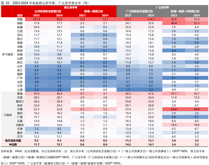从狭义赤字率来看,2024年财政收支差额口径、政府债口径的狭义赤字率均值水平分别为9.2%和0.5%、较2023年基本持平。具体来看:1)从财政收支差额口径来看,由于还包含政府债、中央转移支付、结余调入资金等影响,各省之间差异较大,2024年各省狭义赤字率(公共财政收支差额口径)在2.8%-95.6%区间,其中西藏、青海、黑龙江等较高,而上海、广东、江苏等较低。3)从政府债口径来看,2024年各省狭义赤字率(新增一般债口径)在0.1%到12.7%之间,其中西藏、宁夏、青海等较高。