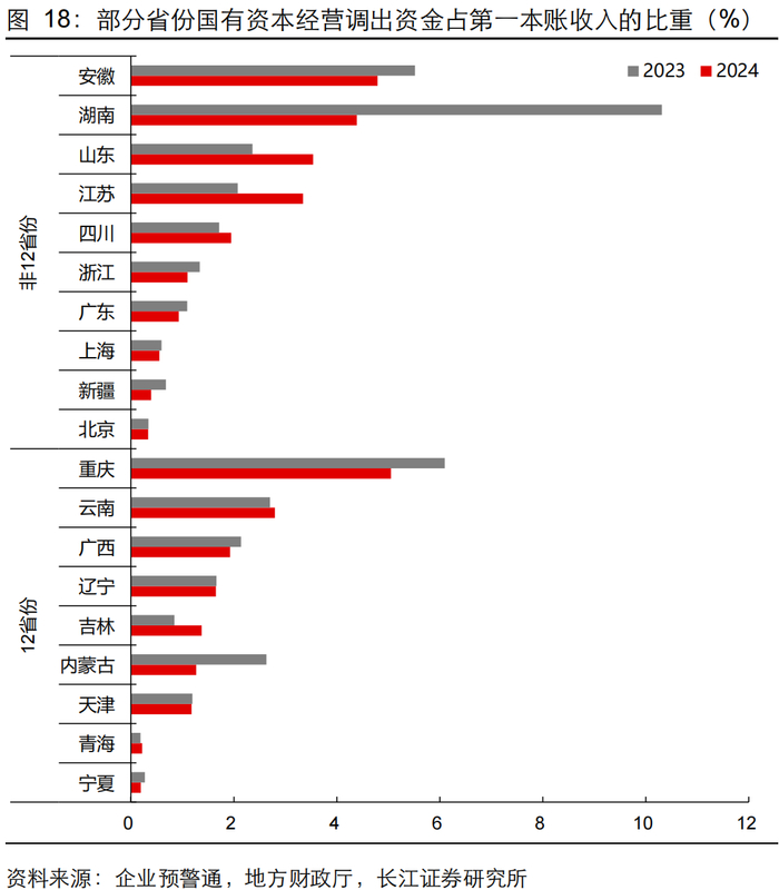 3)就12省份和非12省份而言,2024年12省份国有资本经营收入、支出分别为-4.7%、-23.1%,低于非12省份的2.9%、-11.4%。