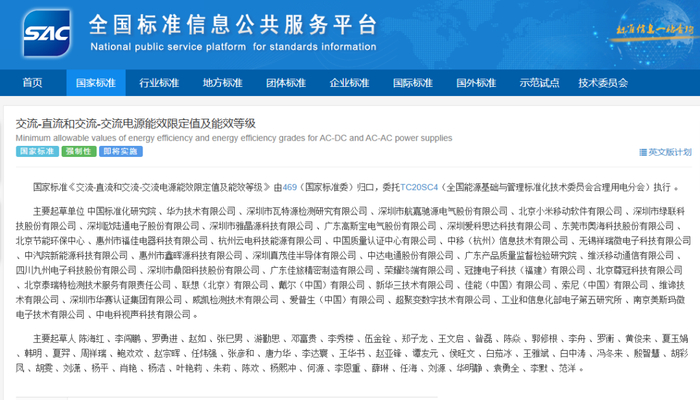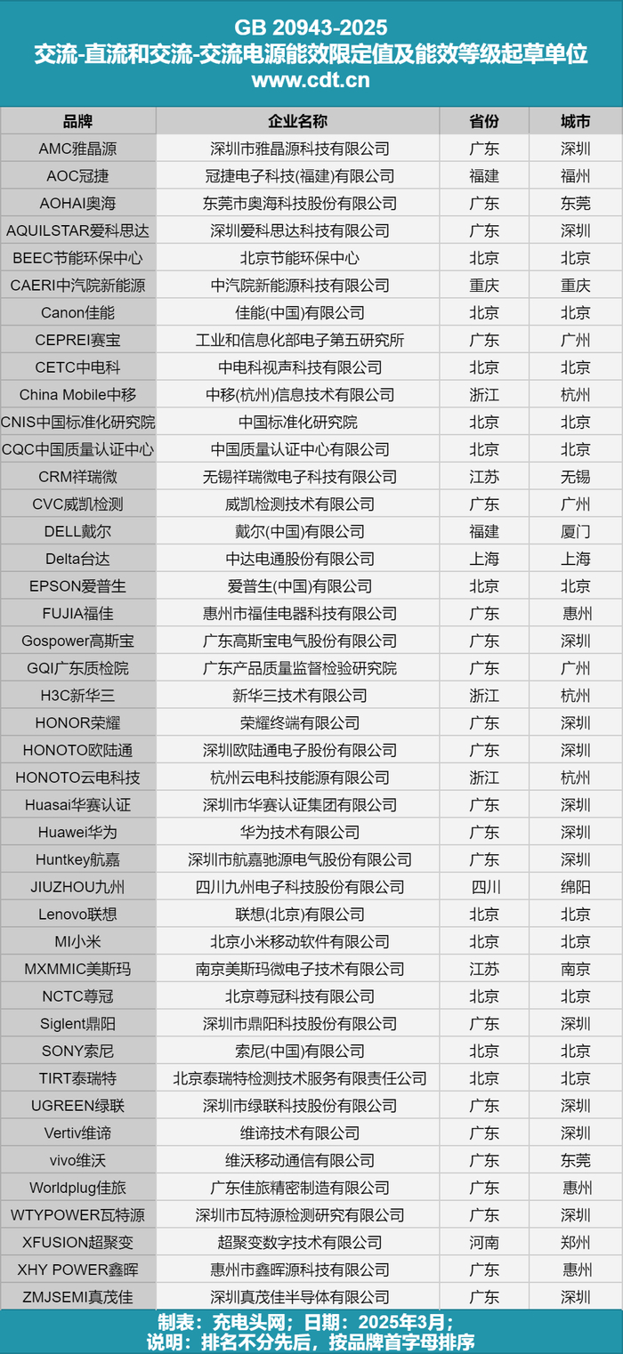 GB 20943-2025标准起草单位覆盖国内外行业领军企业及权威机构,包括中国质量认证中心、工业和信息化部电子第五研究所等国家级检测机构,华为、荣耀、vivo等国内智能终端品牌,雅晶源、航嘉等电源工厂,以及戴尔、佳能、爱普生等跨国企业。