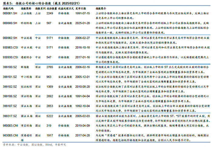 中证、上证、深证、国证系列指数中,分别有其综合指数系列,同一综合指数我们保留价格指数或全收益指数其一,多币种计价时保留以人民币计价的指数,不考虑B股指数,经筛选后列表如下(完整表格可查看附录)。里面包括反映上交所整体上市公司表现的上证指数(000001),反映深交所上市公司整体表现的新指数(399100)、深证综指(399106)、深证A指(399107),反映A股整体价格表现的中证流通(000902)、中证A股(930903)、国证A指(399317),反映科创板上市公司表现的科创综指(000680),反映创业板上市公司整体表现的创业板综(399102),反映原中小企业板上市公司整体表现的中小综指(399101),反映港股通的相关表现的港股综合(930930)、深港通综指(983005)。