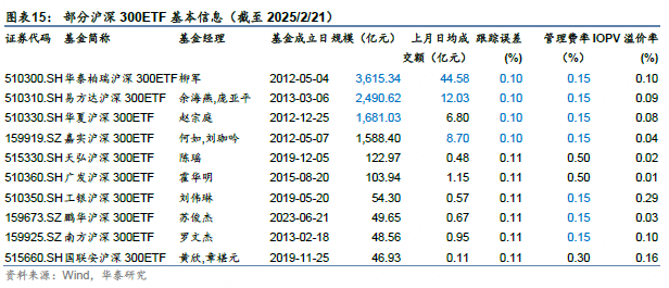 依据ETF的常用筛选标准,我们分别梳理了跟踪全市场、沪市、深市、创业板、科创板相关指数的ETF信息。截至2025/2/21,其中跟踪沪深300的ETF规模近万亿,中证A系列指数的ETF规模增长迅速,中证500和中证1000的可选ETF较多。上证180和深证100ETF虽成立较早,但当前交投不活跃。创业板ETF、科创50ETF的头部效应明显,产品规模相差较大。