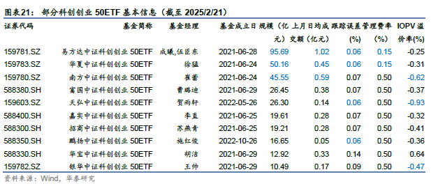 其中科创创业50ETF数量较多,但规模尚未拉开量级上的差距,而科创50ETF中易方达和华夏的规模领先且费率更低,科创100ETF中博时和鹏华的规模在50亿以上,科创200ETF数量较少,且交投活跃度有限。科创综指于2025年1月发布,当前尚未有ETF上市运作,详细内容可查阅《九图详解科创综指》(2025年2月17日)。