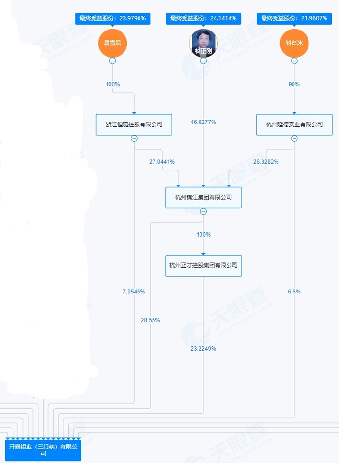 天眼查APP显示,锦江集团持有三门峡铝业28.55%股权,锦江集团的背后则是钭正刚家族。