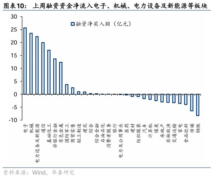 杠杆资金:上周资金净流入126亿元,融资交易活跃度边际回落至10.1%,净流入电子、机械、电力设备等行业,流出钢铁、传媒、食品饮料等行业;