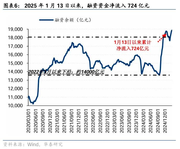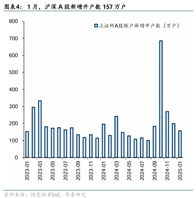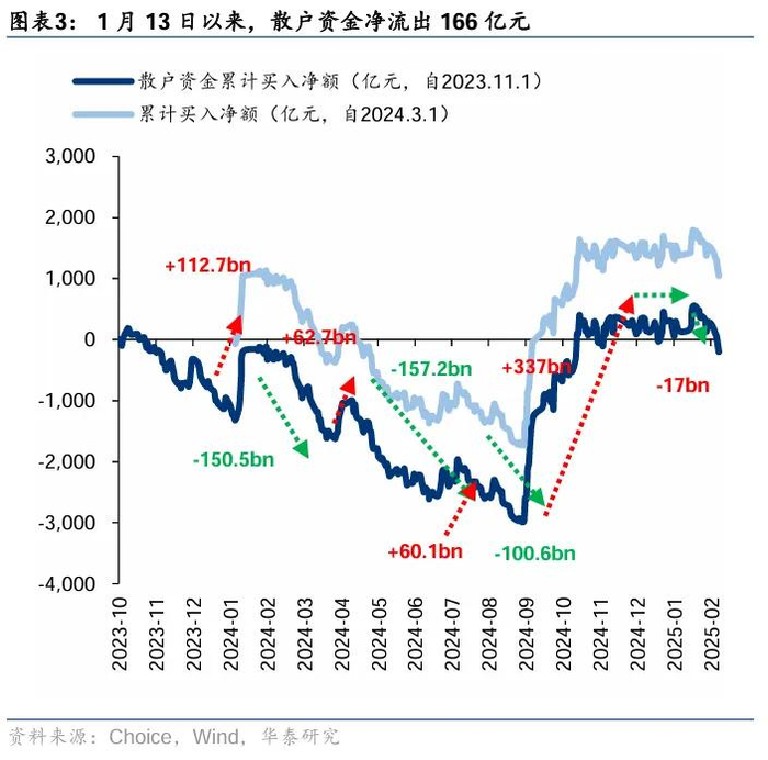 散户资金上周净流入476亿元。①数量角度,1月新增开户数157万户,环比2024年12月有所回落;②流量角度,2025年1月13日以来,散户资金累计净流出166亿元;③方向角度,上周散户资金净流入计算机、通信、钢铁等行业,净流出医药生物、基础化工、有色金属等行业。