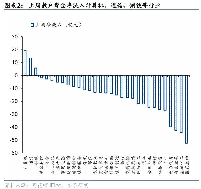 散户资金:上周散户资金净流出476亿元,净流入计算机、通信、钢铁等行业,净流出医药生物、基础化工、有色金属等行业;