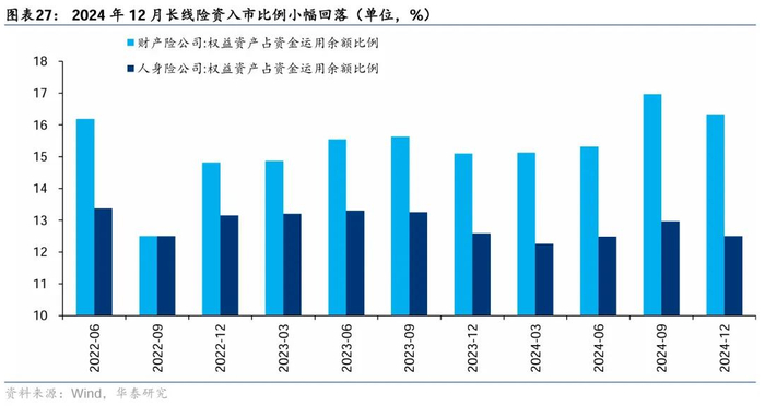 险资入市环比回升。截至2024年12月,财产险公司中权益资产占资金运用比例为16.33%,环比9月16.97%小幅回落,人身险公司中权益资产占资金运用比例为12.50%,较 9月12.97%小幅回落。