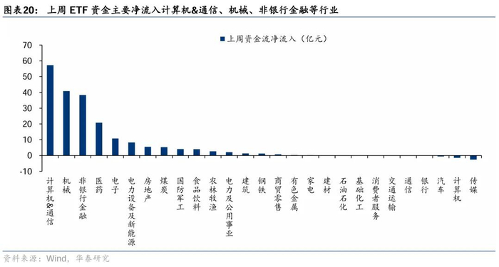 上周ETF转向净申购(增量为行业ETF),宽基指数持续净流出,行业中,计算机&通信、机械、非银行金融等行业净流入居前;