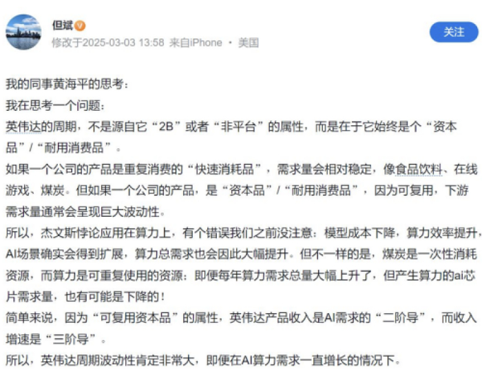 正逢英伟达股价震荡之际,知名基金经理、东方港湾创始人但斌3月3日在社交平台分享了其同事黄海平的一段思考,文章指出,英伟达的周期,不是源自它“2B”或者“非平台”的属性,而是在于它始终是个“资本品”“耐用消费品”。