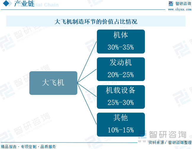大飞机产业链上游为机体、发动机、机载设备等核心部件,其中,机体包括机身、机翼、起落架、尾翼、内饰等;发动机包括主体部件和吊舱;机载设备包括机电系统、航电系统等。产业链中游为大飞机制造。产业链下游为大飞机应用,包括航空运输、旅游产业、物流产业、对外贸易等。上游环节是产业链的技术和资本高地,拥有较高的附加值和技术壁垒;中游环节则表现为劳动密集型,附加值相对较低;下游环节则依赖于上游的技术密集型环节,同样具有较高的附加值。
