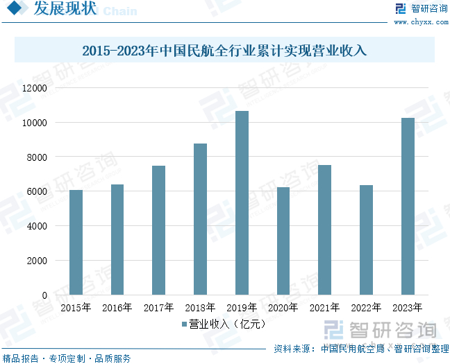 数据显示,受到疫情影响,2022年,中国民航全行业累计实现营业收入6328.9亿元,比2022年下降15.8%。2023年疫情放开,民航业的持续复苏。国内航班目前已恢复至2019年日均水平,趋势较为稳定。2023年中国民航全行业累计实现营业收入10237.3亿元,同比增长61.75%。