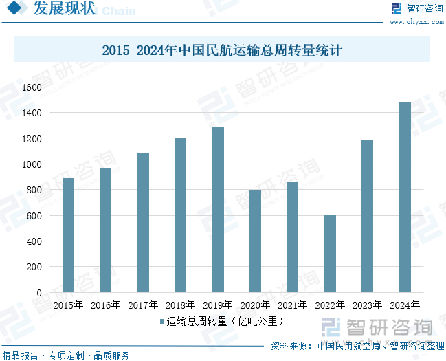 2015-2019年中国民航运输总周转量呈现逐年增长的态势,2020年受疫情的影响,民航运输总周转量有所下降。随着国内经济的持续增长和产业结构的不断优化升级,对高端制造业、电子信息、生物医药等产业的货物运输需求不断增加,从而推动民航运输总周转量的增长。中国民用航空局数据显示,2023年,中国民航运输总周转量为1188.34亿吨公里,比2022年增长98.3%。国内航线完成运输总周转量867.33亿吨公里,比2022年增长123.6%,其中,港澳台航线完成10.00亿吨公里,比2022年增长334.2%;国际航线完成运输总周转量321.01亿吨公里,比2022年增长51.8%。2024年中国民航运输总周转量达1485.2亿吨公里,同比增长24.98%。