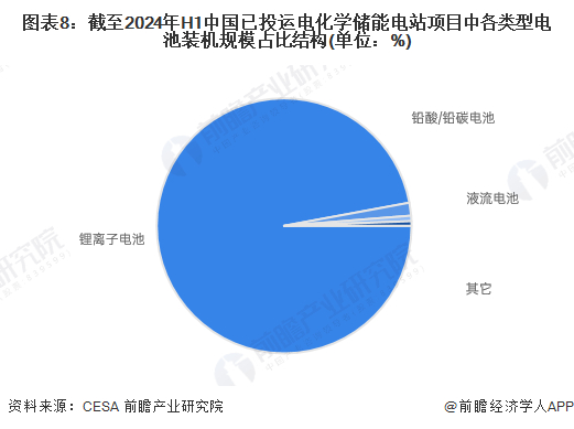 从已投运的电化学储能电站项目电池类型占比来看,截至2024年上半年,锂离子电池占比超九成,占据主要份额,其它液流电池、铅酸/铅碳电池占比较少。