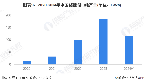根据工信部披露的数据,2020-2023年我国储能锂电池产量呈快速上涨趋势,2023年,我国储能锂电池产量185GWh,增速达到85%。2024年上半年,我国储能锂电池产量110GWh。