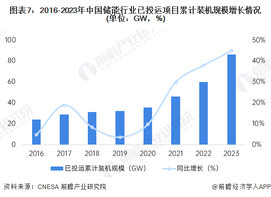 在中国新能源发电规模大幅增长的推动下,中国储能装机规模一直保持高速增长的趋势。根据CNESA历年《储能产业研究白皮书》中统计数据,截至2023年底,中国已投运储电项目累计装机规模为同比增长45%。