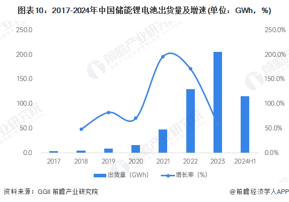 2017-2023年,我国储能锂电池出货量持续上涨。2022年,我国储能锂电池出货量达到130GWh,同比上涨170.8%。2023年,我国储能锂电池出货量达到206 GWh,同比上涨58.5%。2024年上半年储能锂电池出货量116GWh。