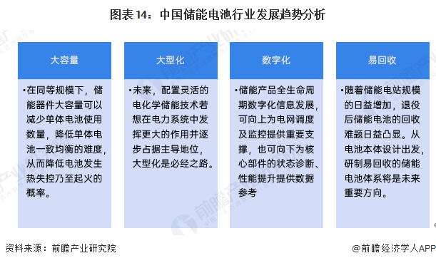 随着中国储能电池行业的快速发展,大容量、大型化、易回收和数字化将成为储能电池主要的发展方向。在大容量方面,同等规模下储能器件的大容量可以减少单体电池使用数量,降低单体电池一致均衡的难度,从而降低电池发生热失控乃至起火的概率;在大型化方面,大型化是配置灵活的电化学储能技术在电力系统中发挥主导的作用的必经之路;在易回收方面,研制易回收的储能电池体系,使回收收益具备吸引力是未来发展大方向;在数字化方面,储能产品全生命周期数字化信息既可以向上为电网调度及监控提供重要支撑,也可以向下为核心部件的状态诊断、性能提升提供数据参考。