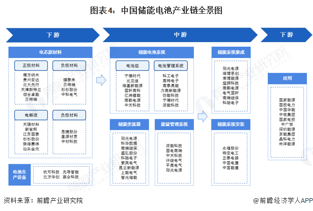 从产业链全景来看,在上游领域,电芯原材料代表企业有德方纳米、贵州安达、贝特瑞、天赐材料、恩捷股份、星源材质等公司;电池生产设备商有杭可科技、先导智能、北方华创、赢合科技等企业。在产业链中游,电池组制造的代表企业有宁德时代、比亚迪、海基新能源、国轩高科等;电池管理系统制造代表企业有科工电子、高特电子、高泰昊能等;储能变流器制造代表企业有阳先电源、科华恒盛、南瑞继保等;能量管理系统制造代表企业有派能科技、国电南瑞、中天科技、平高电气等;储能系统集成代表企业有库博能源、猛狮科技、南都电源、电气国轩等;储能系统安装代表企业有永福股份、特变电工、正泰电器、中国电建、中国能建等。产业链下游系统应用代表企业主要有国家能源、国投电力、中国华能、中核集团等。
