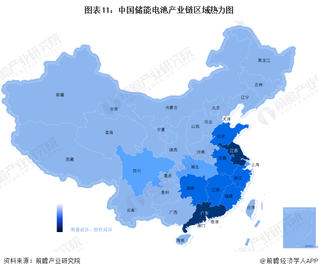 从我国储能电池产业链企业区域分布来看,储能电池产业链企业主要分布在华南、华东区域,其中广东、江苏产业链企业分布最多。