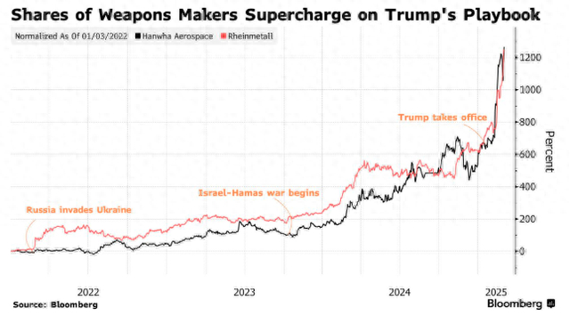在日本,重型机械制造商IHI公司的股价周二一举跃升至了1990年以来的最高点,而韩国主战坦克制造商现代乐铁公司股价则暴涨了11%。