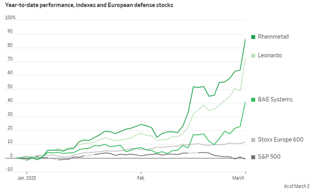 在此背景下,欧洲主要军工股本周伊始纷纷上演了两位数的暴涨:法国泰雷兹公司、德国莱茵金属公司、意大利莱昂纳多公司和瑞典萨博公司等公司的股价周一均飙升了11%以上。尽管周二略有回落,但过去几个月的涨幅依然惊人。