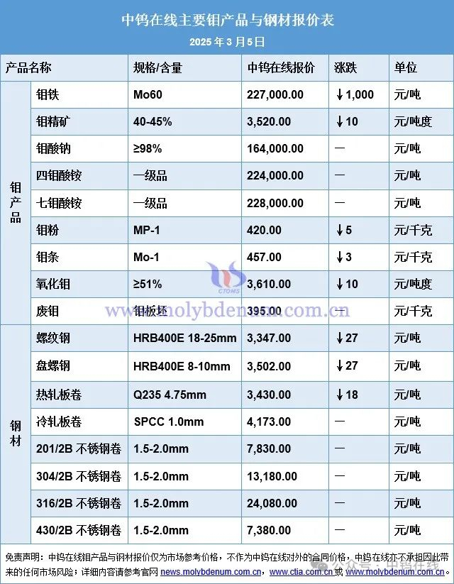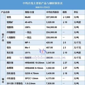 2025年3月5日钼价和钢价一览