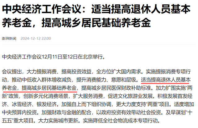 但是,我们回顾一下官方的表述,第一次提出2025年提高城乡居民基础养老金,是在去年12月12日召开的中央经济工作会议。会议提出适当提高退休人员基本养老金,提高城乡居民基础养老金。