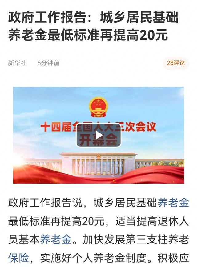 3月5日,在今年政府工作报告中提到,城乡居民基础养老金最低标准再提高20元,适当提高退休人员基本养老金。