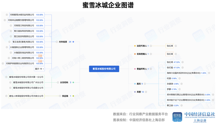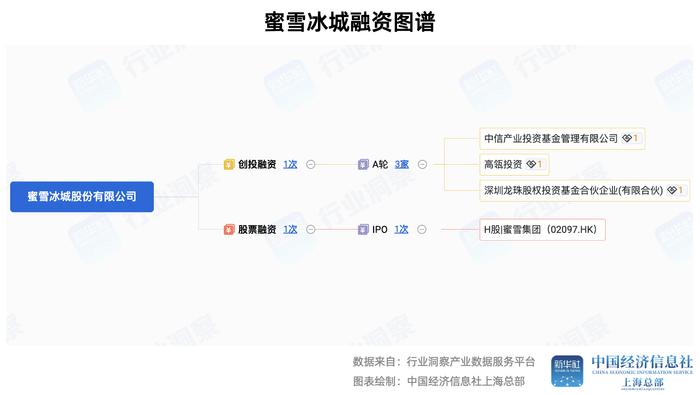 中国经济信息社上海总部行业洞察产业数据服务平台(简称“行业洞察系统”)显示,在本次IPO之前,蜜雪冰城在2020年12月开放了首次也是唯一一轮创投融资,由高瓴资本、美团龙珠(深圳龙珠为美团龙珠旗下关联基金)、中信产业投资基金领投,融资规模约20亿元。据悉,这三家机构不仅给予了资金支持,还提供了重要的战略资源,如美团龙珠的本地生活流量支持、高瓴的全球化资源等。此次蜜雪冰城IPO,高瓴资本与美团龙珠均为再度加持的股东。