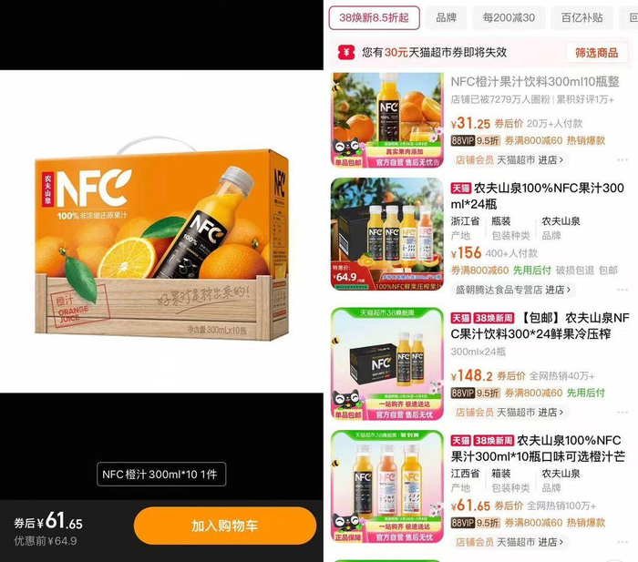 曾凭借干净配料、纯正风味和丰富营养,NFC鲜榨果汁在追求品质生活的消费者中备受追捧,即便价格高昂也未能阻挡其畅销。然而当下,市场情况发生巨变。记者走访连锁便利店及商超发现,此前市面上常见的一款NFC果汁,300ml规格价格已普遍跌破10元,在南京浦口区一家商超,900ml规格更是低至 9.9 元,价格“神话”不再,且从冷藏柜移至普通货架,变身常温饮品,网络平台部分店铺价格甚至比线下更低。