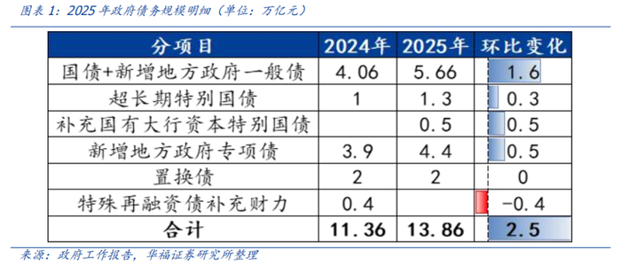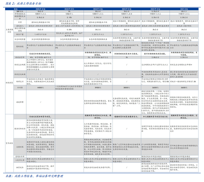 经济增长目标定为5%左右,基本符合市场预期。财政政策方面,定调更加积极的财政政策,具体来看:赤字率从3%上调到4%,对应赤字规模(即普通国债+新增地方政府一般债)5.66万亿元,较2024年增加1.6万亿元;超长期特别国债1.3万亿元(其中3000亿元用于支持消费品以旧换新),较2024年增加3000亿元;发行5000亿元特别国债支持国有大行补充资本;地方政府专项债4.4万亿元(即新增地方政府专项债),较2024年增加5000亿元,重点用于投资建设、土地收储和收购存量商品房、消化地方政府拖欠企业账款等,其中企业账款问题还提到“加力推进清理拖欠企业账款工作,强化源头治理和失信惩戒,落实解决拖欠企业账款问题长效机制”。货币政策方面,定调适度宽松的货币政策,重提“适时降准降息”,强调“优化和创新结构性货币政策工具,更大力度促进楼市股市健康发展,加大对科技创新、绿色发展、提振消费以及民营、小微企业等的支持”,我们认为不排除后续推出消费类结构性货币政策工具的可能性,也可能降低部分结构性货币政策工具利率。财政政策和货币政策的取向也与中央经济工作会议定调保持一致。本次政府工作报告还强调了“政策组合拳”的重要性:统筹政策制定和执行全过程,提升政策目标、工具、时机、力度、节奏的匹配度。出台实施政策要能早则早、宁早勿晚,与各种不确定性抢时间,看准了就一次性给足,提高政策实效。预计2025年财政和货币将有更多的配合,发债节奏、政策落地或将前置。