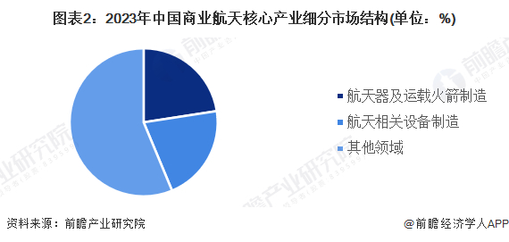 商业航天的核心产业涉及航天器及运载火箭制造、航天相关设备制造、卫星制造、包括航天发射服务、卫星遥感、通信服务在内的商业航天运输和服务业等。2023年我国商业航天核心产业中除了商业航天运输和服务业以外,航天器及运载火箭制造业收入占比最高超过20%。