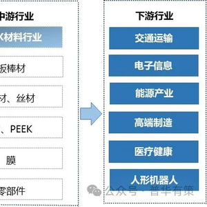 PEEK属于合成树脂制造行业,其上游涉及化学原料和化学纤维制造,关键原材料包括氟酮。下游应用涵盖了多个行业,如交通、航空航天、电子、能源、医疗及人形机器人等。